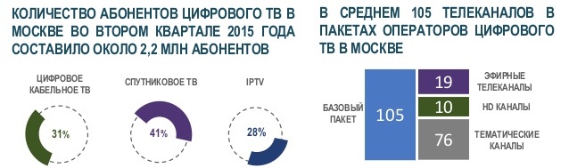 Как отмечает ДИТ, в первом полугодии 2015 года быстрее всего рос сегмент IPTV. Основным драйвером на этом рынке было агрессивное продвижение провайдерами пакетных предложений Double Play и Triple Play ("Интернет+ТВ", "Телефон+интернет+ТВ"). В настоящее время пакетными тарифами пользуются уже около трети всех столичных абонентов цифрового ТВ, при этом наблюдается стабильный рост спроса на пакеты с HD-каналами.