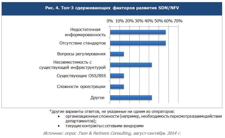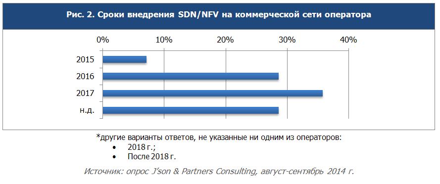 "Подавляющее большинство опрошенных российских операторов считает, что внедрение технологий SDN/NFV на коммерческой сети состоится через 2-3 года, т.е. в 2016-2017 гг. Около 7% респондентов считают, что это произойдет уже в следующем 2015 году, в то время как 29% затруднились ответить", - сообщает исследовательская компания.