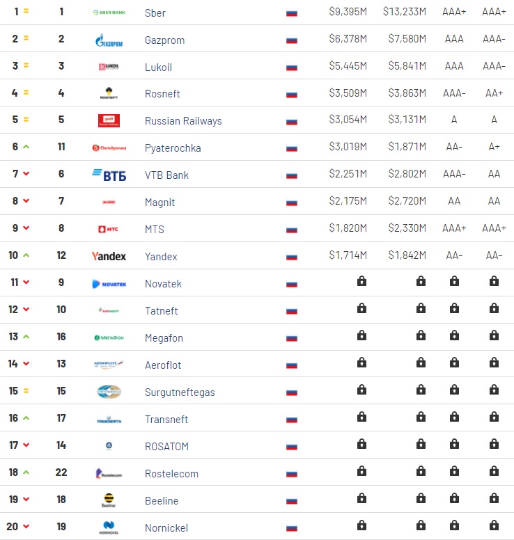 Компания МТС заняла 9 место, потеряв одну позицию по сравнению с прошлым годом. 13-е и 18-е места заняли "Мегафон" и "Ростелеком". Оба оператора продемонстрировали рост на 3 и 4 позиции соответственно. Компания "билайн" опустилась на 19-е место по сравнению с 18-м местом в прошлом году.