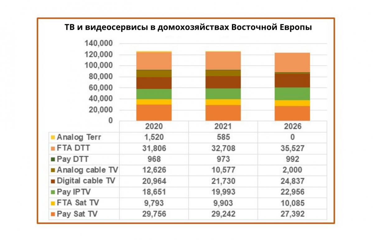 Рынок платного ТВ в Восточной Европе ожидает спад, об этом твердят аналитики не первый год. В период с 2020 по 2026 год операторы платного ТВ в Восточной Европе потеряют почти 5 млн абонентов, достигнув отметки в 78,18 млн.