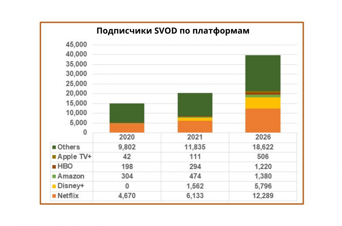 Согласно прогнозам, абонентская база SVOD в Восточной Европе достигнет 40 млн к 2026 году. Прирост в 10 млн абонентов придется на Россию, 6 млн – на Польшу.