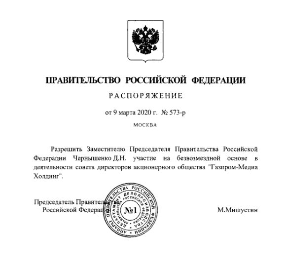 Бывший генеральный директор "Газпром-медиа" (ГПМ) Дмитрий Чернышенко сможет участвовать в совете директоров компании. Такое распоряжение подписал премьер-министр РФ Михаил Мишустин.