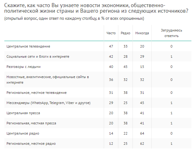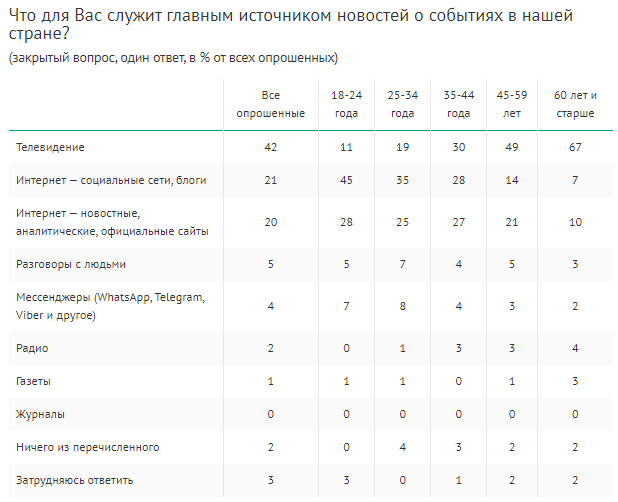 При этом, отвечая на вопрос "Что для Вас служит главным источником новостей о событиях в нашей стране?", 42% респондентов назвали телевидение (11-19% среди молодежи), 21% — социальные сети и блоги в интернете (35-45% среди молодежи), 20% — новостные, аналитические и официальные сайты в интернете, 5% — разговоры с людьми, и только 4% назвали мессенджеры.