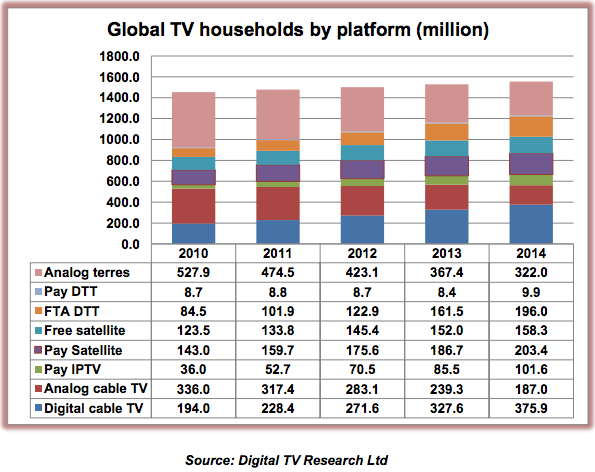 С конца 2010 года по конец 2014 года в мире было подключено порядка 455 млн новых цифровых телевизионных домохозяйств, в результате чего суммарное их количество достигло отметки 1,045 млрд, гласят выводы нового исследования Digital TV Research (тут надо учитывать, что аналитическое агентство производило свои подсчеты не по всем странам мира, а среди 138 государств). Таким образом, глобальное проникновение цифрового ТВ за указанный период выросло с 40,5% до 67,2%.