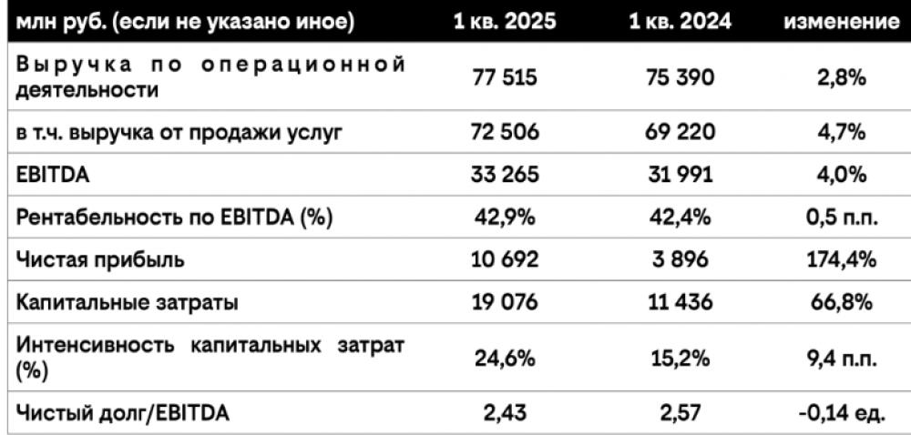 Согласно отчету, выручка по операционной деятельности компании достигла 77,5 млрд руб., увеличившись на 2,8% год к году. Данный результат обусловлен ростом на 4,7% сервисной выручки от продажи услуг. Прибыль по показателю EBITDA выросла на 4% — до 33,3 млрд руб. год к году.