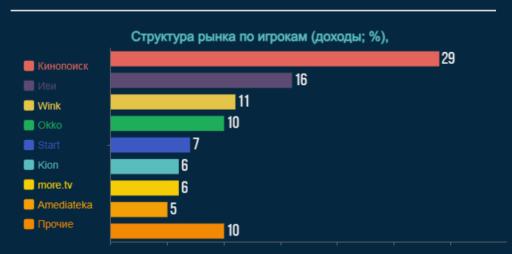 Темпы роста Kion составили 40%. Число платных подписчиков увеличилось на 45%. Между тем, выручка онлайн-кинотеатра more. tv выросла на 57%, а количество подписчиков — на 42%. Еще один видеосервис с рыночной долей свыше 5% — Amediateka — продемонстрировал темпы роста в 15%. Число платных пользователей увеличилось на 43%. Это обусловлено появлением в библиотеке сервиса новых сериалов из США, Австралии, Израиля, Скандинавии.