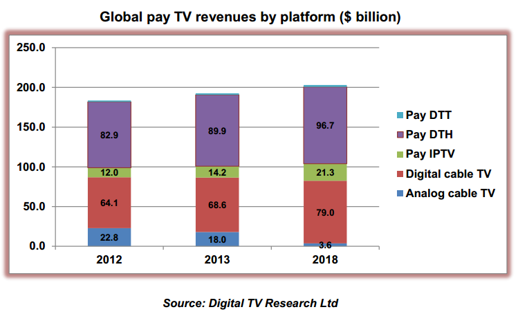 Судя по прогнозам роста выручки операторов платного ТВ по 97 странам, объем рынка (включая платежи по подписке и VOD) достигнет к 2018 году $203 млрд, прибавив с 2012 года $19 млрд. Фаза быстрого роста пройдена, и в 2013 году рост составит 3,2%, а начиная с 2015 года замедлится и не будет превышать 2%.