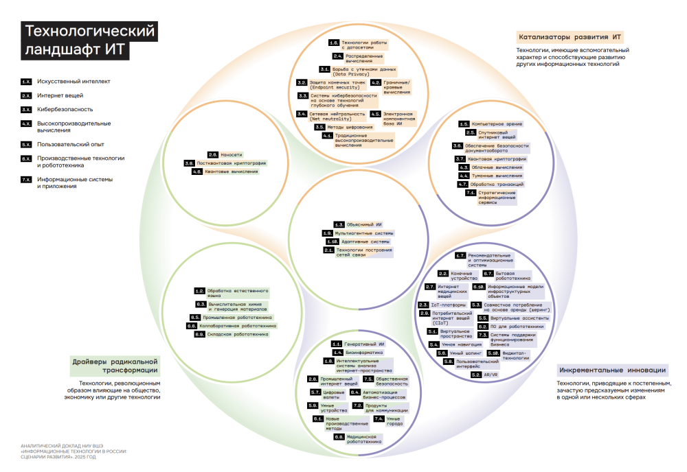 Технологический ландшафт российского ИТ-рынка включает семь ключевых направлений: искусственный интеллект, интернет вещей, кибербезопасность, высокопроизводительные вычисления, пользовательский опыт, производственные технологии с робототехникой и информационные системы.