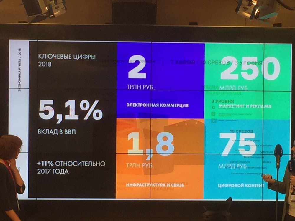 Одной из тем обсуждения участников конференции стал рынок рекламы. Отмечается, что в 2018 году интернет впервые обогнал телевидение по рекламным доходам. Объем рынка интернет-рекламы за первое полугодие составил 90,5-91,5 млрд рублей, в то же время объем рынка ТВ-рекламы достиг 90-91 млрд рублей. Однако видеореклама за нынешний год стала самым быстрорастущим сегментом рынка интернет-рекламы, в том числе за счет роста персонализации и использования различных типов таргетинга. По предварительным оценкам, ее объем к концу 2018 года вырастет на 25% и составит 10 млрд рублей.