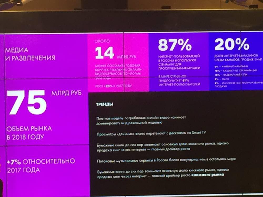 Объем рынка медиа и развлечений в этом году составил 75 млрд рублей, что на 7% выше относительно 2017 года. Эксперты рассказали, что платная модель потребления онлайн-видео начинает доминировать над рекламной моделью и по итогам 2018 года годовая выручка легальных онлайн-видеосервисов может составлять около 14 млрд рублей, что на 20% больше показателя 2017 года. Более того, 61% аудитории интернета в мире предпочитают использовать стриминговые сервисы. Также, согласно результатам исследования, просмотры "длинных" видео перетекают с десктопов на SmartTV.