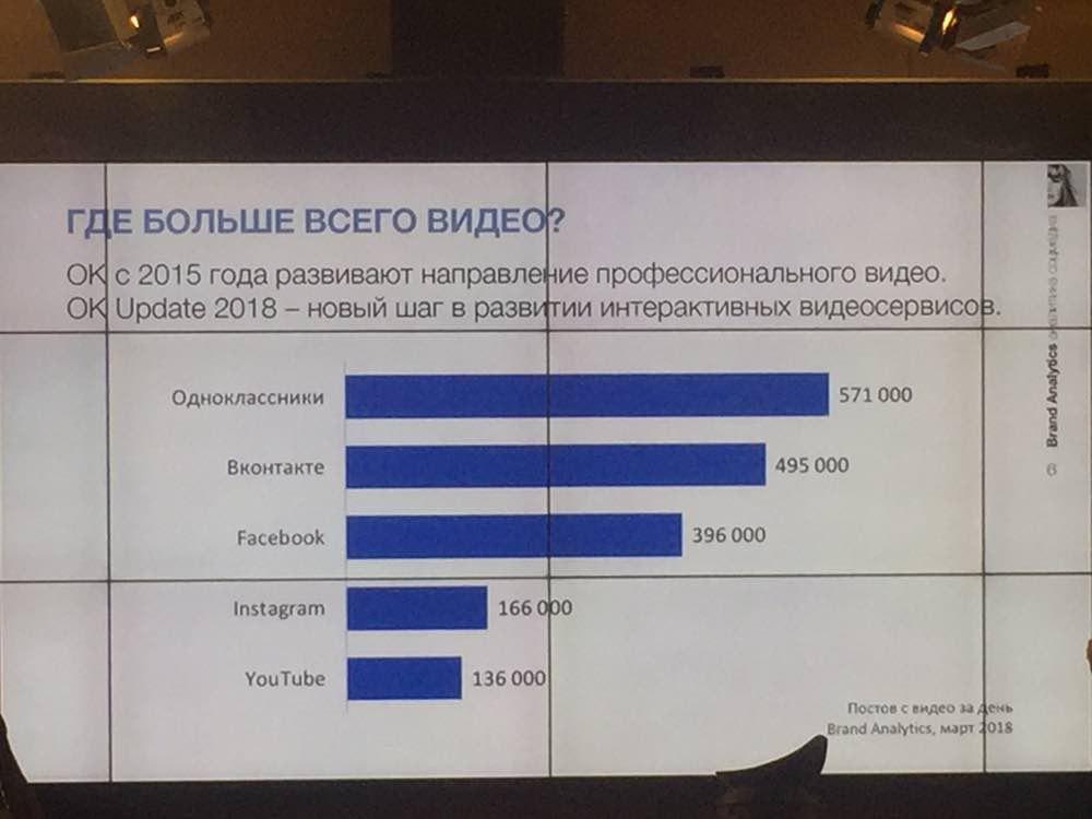 Василий Черный, представитель компании Brand Analytics, презентовал исследование "Соцсети в России: главные выводы исследования (осень 2018) и тренды (2019)". Согласно его результатам, платформа Youtube занимает шестое место по количеству сообщений за месяц и пятое место по количеству авторов. Отдельной темой в исследовании стало видеосмотрение в социальных сетях. По объему видеоконтента лидируют "Одноклассники" - благодаря тому, что соцсеть с 2015 года развивает направление профессионального видео, а в 2018 году она представила масштабное обновление, в том числе запустила новую платформу для создателей профессионального и полупрофессионального контента – творческую студию. Чаще всего среди соцсетей для публикации видео используется Youtube. Второе место в рейтинге занимает Facebook (19,1% видео от общего контента в соцсети), далее – "Одноклассники" (13,6%), Instagram(9,2%) и "ВКонтакте" (6,2%). Однако в Instagram видеоконтента меньше, но комментируют пользовательский контент охотнее, чем профессиональный в "Одноклассниках". И в Instagram и в "ВКонтакте" видео комментируются охотнее, чем текст, в отличие от Facebook и "Одноклассники".