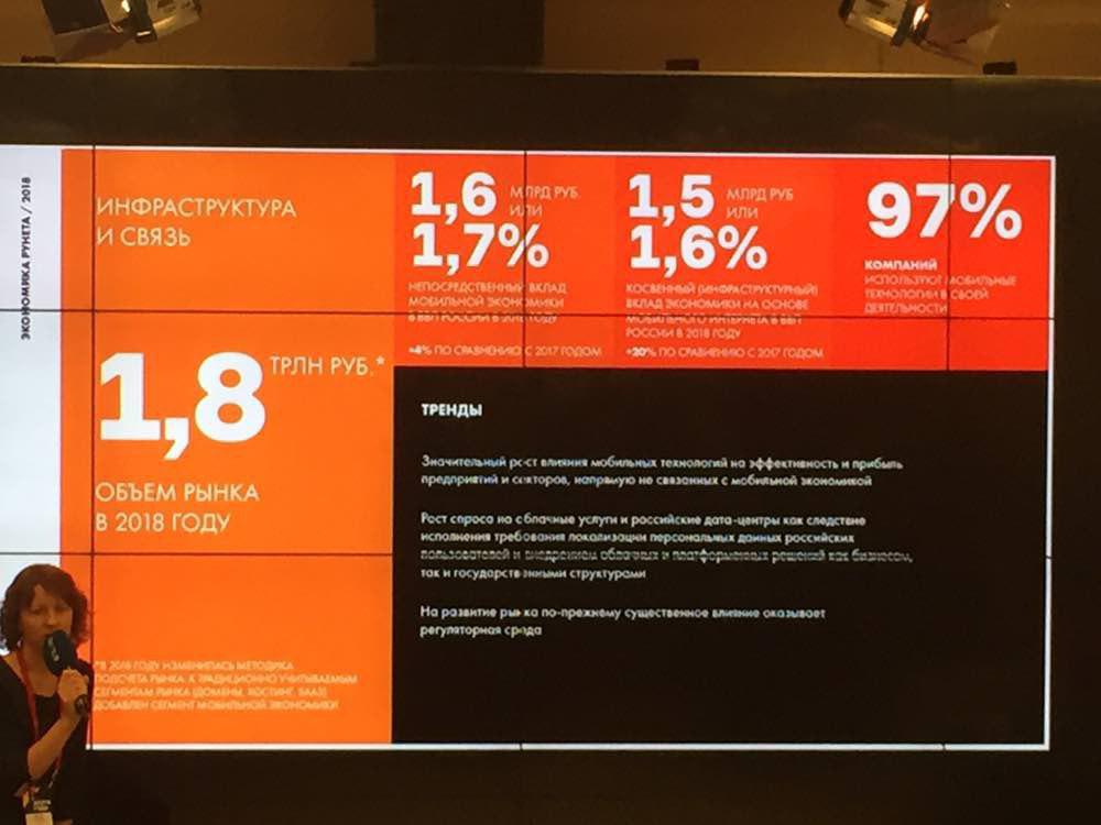 Вклад мобильной экономики в ВВП России вырос на 4% по сравнению с 2017 годом и составил 1,6 млрд рублей. Инфраструктурный вклад экономики на основе мобильного интернета в ВВП достиг 1,5 млрд рублей, увеличившись на 20% по сравнению с предыдущим годом. Основными трендами, которые выделили специалисты в данной области, стали рост спроса на облачные услуги и российские дата-центры, а также значительный рост влияния мобильных технологий на эффективность и прибыль предприятий и секторов. Также было отмечено, что на развитие рынка по-прежнему существенное влияние оказывает регуляторная среда.