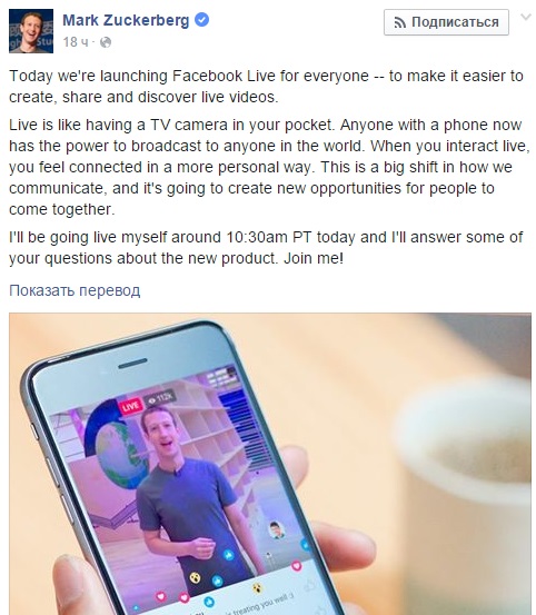С помощью Facebook Live пользователи соцсети могут вести прямые видеотрансляции, обмениваться ими, общаться с друзьями и смотреть их ролики. Они также могут общаться между собой в реальном времени с помощью видео, подчеркивает Цукерберг.