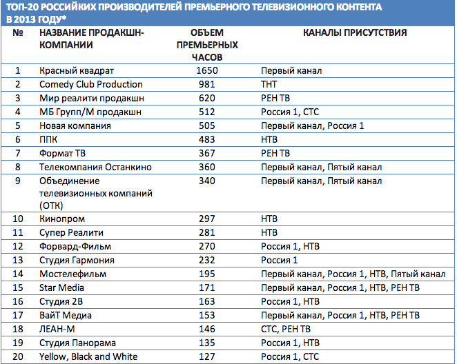 Топ лидеров по производству премьерного телевизионного контента в прошлом году возглавила компания "Красный квадрат", производившая контент для Первого канала. На ее долю пришлось 1650 премьерных часов. Второе место занимает Comedy Club Production (производит контент для ТНТ), тройку лидеров замыкает "Мир реалити продакшн" (РЕН ТВ).