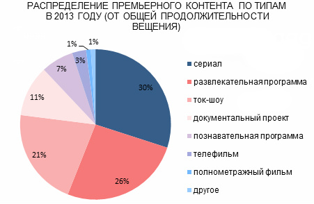 В целом на российские премьеры на крупнейших каналах в прошлом году пришлось 12 тысяч часов. Исследователи не учитывали информационные программы, новости, утренние информационно-развлекательные программы, трансляции спортивных мероприятий и концертов, лотереи. Наибольшая доля вещания – 47% - пришлась на развлекательные программы и ток-шоу, за ними следуют телесериалы и телефильмы – 33%.