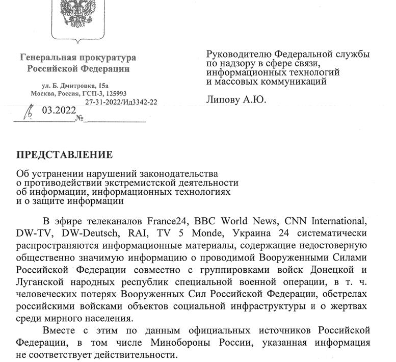 В письме, подписанном первым заместителем генерального прокурора А.В.Разинкиным, говорится, что в эфире телеканалов France24, BBC World News, CNN International, DW-TV, DW-Deutsch, RAI, TV5 Monde, Украина 24 "систематически распространяются информационные материалы, содержащие недостоверную общественно значимую информацию о проводимой Вооруженными Силами Российской Федерации совместно с группировками войск Донецкой и Луганской народных республик специальной военной операции, в т.ч. человеческих потерях Вооруженных сил Российской Федерации, обстрелах российскими войсками объектов социальной инфраструктуры и о жертвах среди мирного населения". Напомним, что достоверной информацией российские власти считают только ту, что распространяется официально подтвержденными информационными источниками, контролируемыми государством.