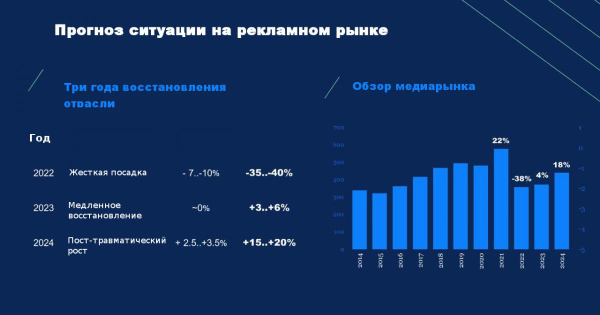 В следующем году после прекращения падения экономики будет наблюдаться небольшой рост, 3—6%. И только в 2024 году рост рынка вернется к двузначным числам — 15-20%. Однако достичь показателей 2021 года еще долго будет невозможно, полагают эксперты Group4Media.