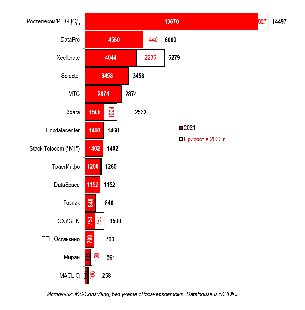 На втором месте по результатам 2021 года оказалась компания DataPro c долей 8,7% (4560 стойко-мест). Замыкает тройку лидеров 2021 года компания IXcellerate с долей 7,7% (4044 стойко-мест). Но в 2022 году она может и переместиться на вторую позицию, если будет введена площадка MOS 3 на территории южного кампуса компании.
