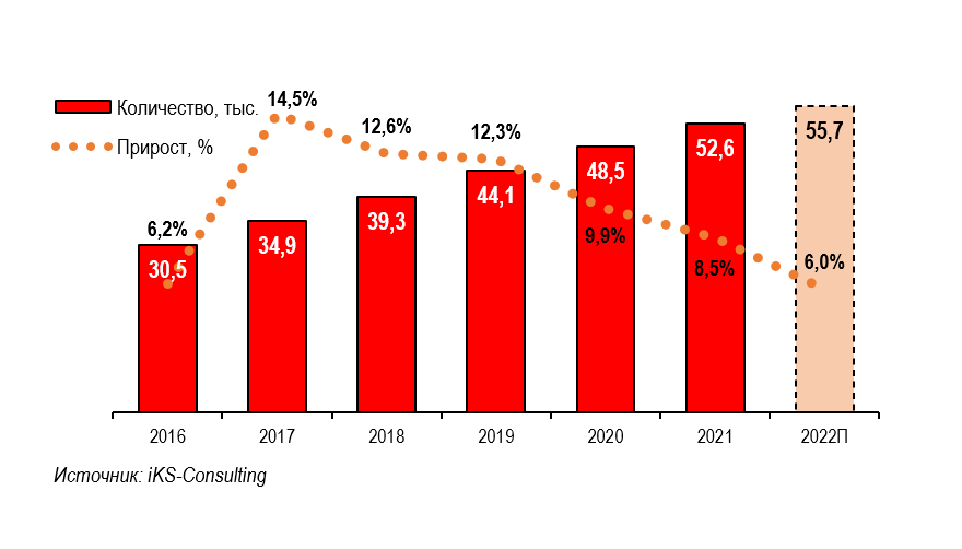 Число стойко-мест в России, предназначенных для коммерческой эксплуатации, увеличилось с 48,5 тыс. единиц в 2020 году до 52,6 тыс. в 2021. То есть рост составил 8,5%. По прогнозам iKS-Consulting, в эксплуатацию будет введено не менее 3100 новых стойко-мест. В этом случае общее количество введенных стойко-мест составит более 55 тыс.