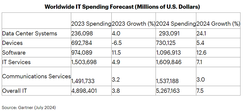 Общемировые расходы на ИТ в 2024 году составят $5,26 трлн, что на 7,5% больше, чем в 2023 году, прогнозируют эксперты американской аналитической компании Gartner в опубликованном отчете.