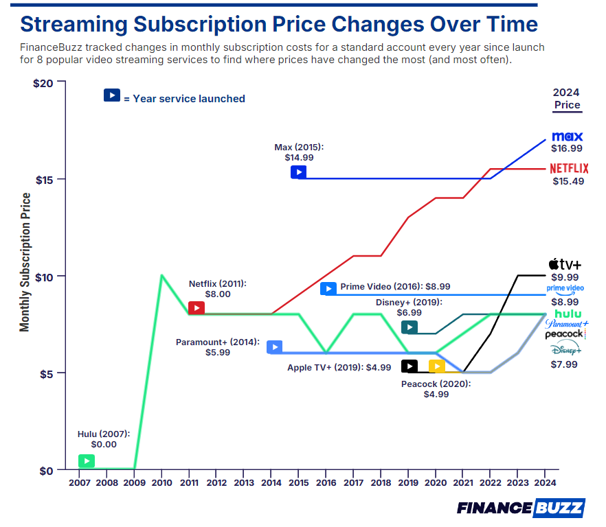 Эксперты американского сервиса FinanceBuzz проанализировали ежемесячные цены для стандартных и премиум-подписчиков стримингов в течение 20 лет с момента их запуска. В исследование попали крупнейшие платформы Hulu, Paramount+, Peacock, Max, Netflix, Prime Video и Apple TV+.