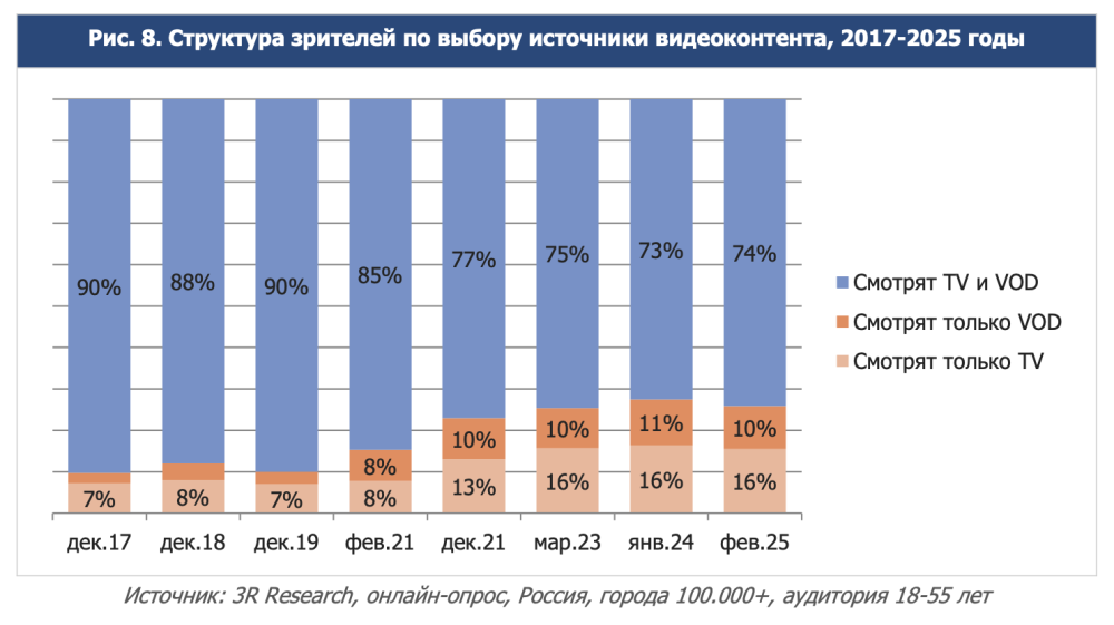 Аудитория "Подписчики на экосистемы" выросла с 68,1% в 2024 году до 73,6% в 2025 году. Предпочтения в просмотре контента остались стабильными: 15,5% респондентов смотрят телевидение, 10,4% — видеосервисы. Более половины пользователей VOD смотрят онлайн-видео ежедневно (51,1%).