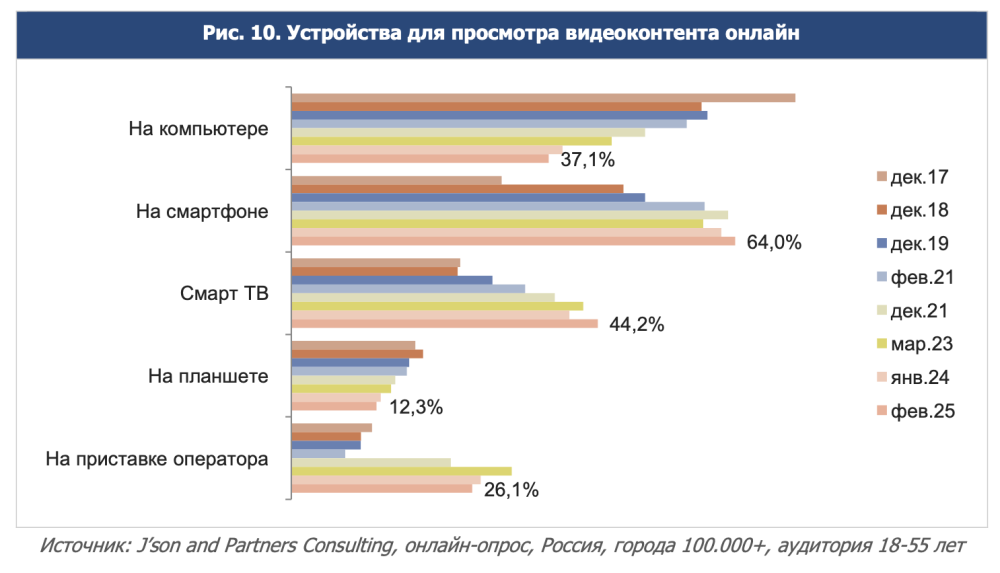 В феврале 2025 года компания J’son and Partners Consulting провела онлайн-опрос среди жителей российских городов с населением от 100 000 человек в возрасте 18-55 лет. В отчете представлены данные об общей аудитории видео и подписчиках, а также анализ предпочтений по жанрам контента и использованию пиратских видеосервисов.
