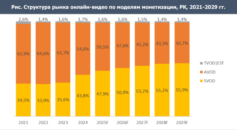 Так как казахстанский рынок онлайн-видео является развивающимся, то в 2021–2023 годах на нем преобладала рекламная модель. Прогнозируется, что за счет развития экосистемы и операторских сервисов подписка станет основным источником выручки начиная с 2026 года. Также ожидается, что в дальнейшем рынок Казахстана будет все больше приближаться по своей структуре к развитым. На подобных рынках характерно доминирования SVOD.
