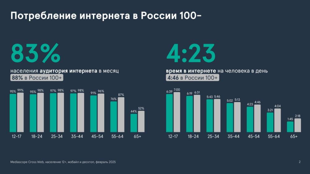 Согласно полученным данным, среднемесячная аудитория интернета среди населения малых городов составляет 83%, а время, проведенное в сети – 4 часа 23 минуты на человека в день. В крупных городах эти показатели ненамного выше – 88% и 4 часа 46 минут соответственно.