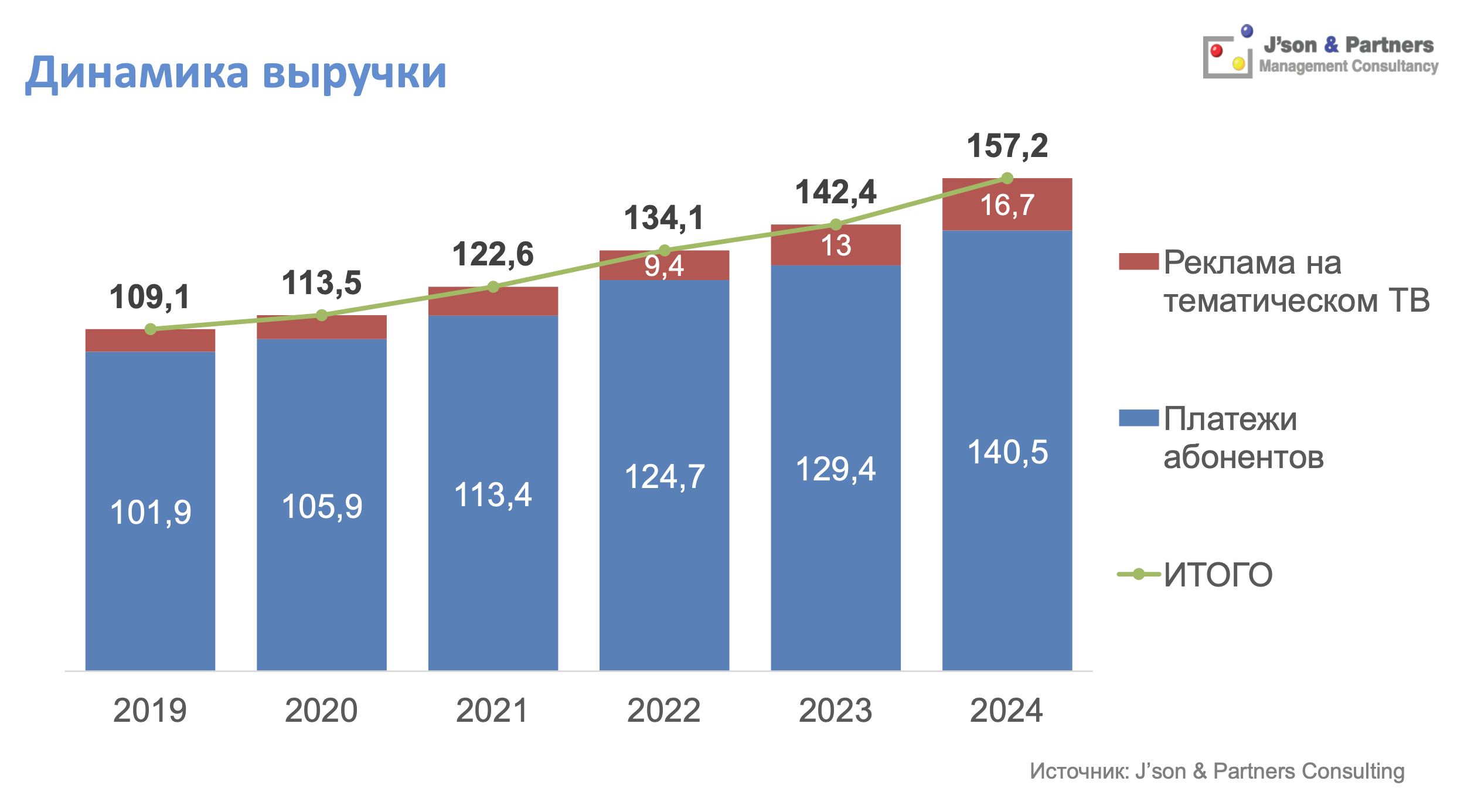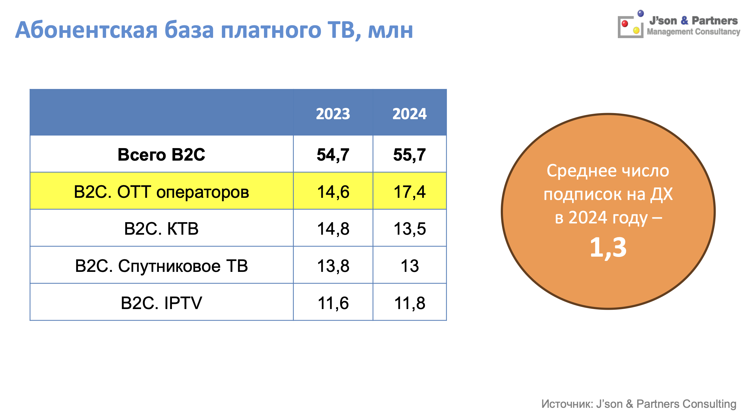 За последний год количество абонентов увеличилось на 1 млн, но рост идет только в сегментах ОТТ и IPTV. Среднее количество подписок на домохозяйство составляет 1,3, хотя в течение последних пяти лет рост доходов от абонплаты не дотягивает до уровня инфляции. При этом, доходы от рекламы на платных каналах растут. 2/3 спроса на платном телевидении приходятся на киносериальные каналы, на втором месте по популярности познавательные и детские телеканалы.