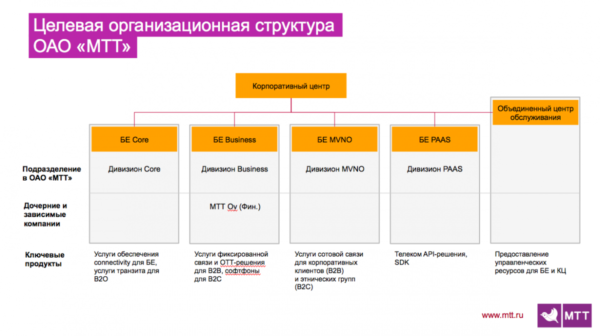 Помимо финансовой отчетности глава МТТ поделился планами по реорганизации структуры управления группы. К первому кварталу 2016 года новая структура будет состоять их Корпоративного центра, Объединенного центра обслуживания и четырех бизнес-единиц: Core, Business, MVNO и PaaS.