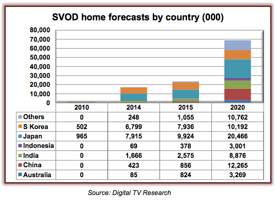 По мнению аналитиков, модель SVOD станет самой прибыльной для OTT-игроков исследуемого региона к 2018 году. Выручка OTT-рынка от подписки вырастет с $1,032 млрд по итогам 2014 года до $4,763 млрд к 2020-ому. Япония здесь также будет впереди планеты всей (а точнее, других стран АТР), а за ней с отрывом почти вдвое расположится Южная Корея.