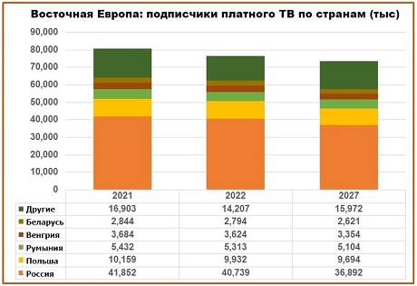 Западные платформы SVoD ушли из России и вряд ли вернутся до 2027 года, заявили в Digital TV Research. Эти сервисы оказали лишь ограниченное влияние в РФ, поэтому потери абонентов не так велики. Россия не так зависима от западного контента, как многие другие европейские страны. Однако санкции приведут к экономическим трудностям, которые негативно скажутся на расходах российских домохозяйств.