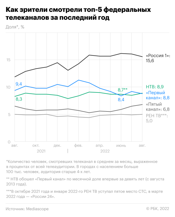 Лидером по доле аудитории стал телеканал "Россия 1", доля его аудитории составила 14,3% в феврале и 15,6% — в августе. Максимальная доля канала за I полугодие 2022 года составила 16,2% в июне. После начала военной спецоперации в Украине россияне стали больше интересоваться новостными программами, и канал увеличил время в сетке эфира на подобные передачи, сократив время развлекательных. Так, из расписания временно убрали "Судьбу человека" (ведущий Борис Корчевников) и "Прямой эфир" (ведущий Андрей Малахов), зато увеличили время политической программы "60 минут", которую ведет Ольга Скабеева, и вернули общественно-политическую программу "Кто против?", которая идет почти три часа, между выпусками "Вестей" в 14.00 и 17.00.
