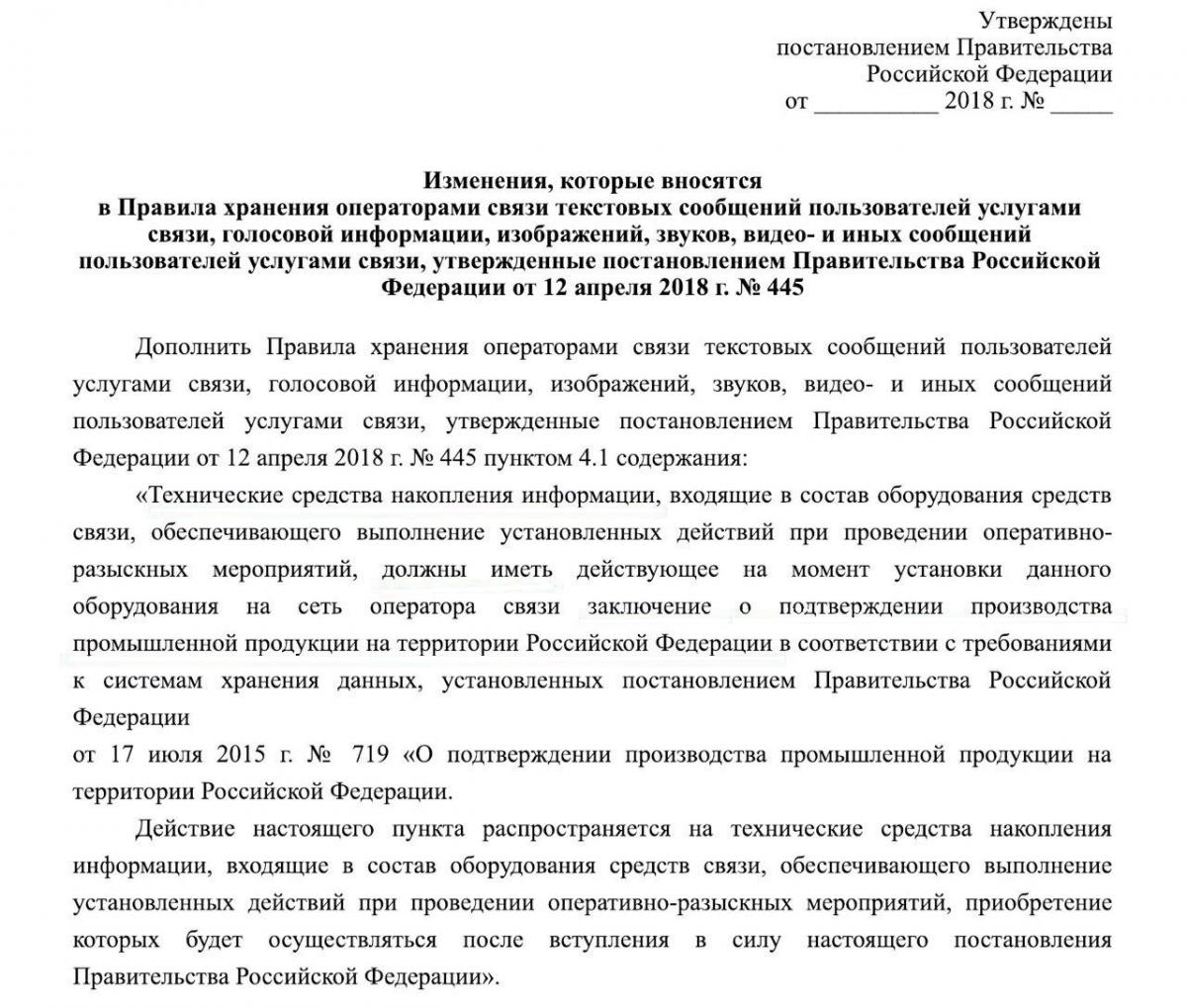 Согласно постановлению, опубликованному на федеральном портале проектов нормативных правовых актов, Минкомсвязь, ФСБ и Минпромторг предложили обязать операторов связи использовать для хранения сообщений пользователей по "закону Яровой" произведенное в России оборудование. Об этом пишет "Коммерсантъ". В документе уточняется, что технические средства накопления информации для систем оперативно-разыскных мероприятий (СОРМ) "должны иметь действующее на момент установки данного оборудования на сеть оператора связи заключение о подтверждении производства промышленной продукции на территории РФ".