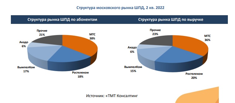 Если говорить о московском рынке, то его финансовый объем во 2 квартале 2022 достиг отметки в 4,3 млрд рублей, а совокупная абонентская база составила 4,4 млн пользователей. Проникновение превышает 90%. Крупнейшими операторами стали "МТС", "Ростелеком", "ВымпелКом" и "Акадо".
