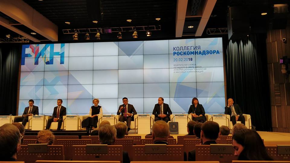 Расширенное годовое заседание коллегии Роскомнадзора прошло 20 февраля 2018 года в Москве. Как передает наш постоянный обозреватель Роман Климас, мероприятие собрало чиновников и медиаменеджеров федерального уровня. На сцене и в зале, помимо руководителей службы, были замечены депутат Госдумы Ирина Яровая, член Совета Федерации Виталий Богданов, глава Минкомсвязи Николай Никифоров, генпродюсер Первого канала Александр Файфман, глава "Газпром-Медиа" Дмитрий Чернышенко, представители ЦИК, Национальной медиа группы, РТРС.