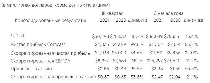 Американская телекоммуникационная корпорация Comcast опубликовала финансовый отчет по итогам третьего квартала 2021 года. Общая выручка компании выросла на 18,7% до $30,3 миллиарда за квартал, превысив среднюю оценку аналитиков в $29,87 миллиарда долларов, согласно данным IBES от Refinitiv.