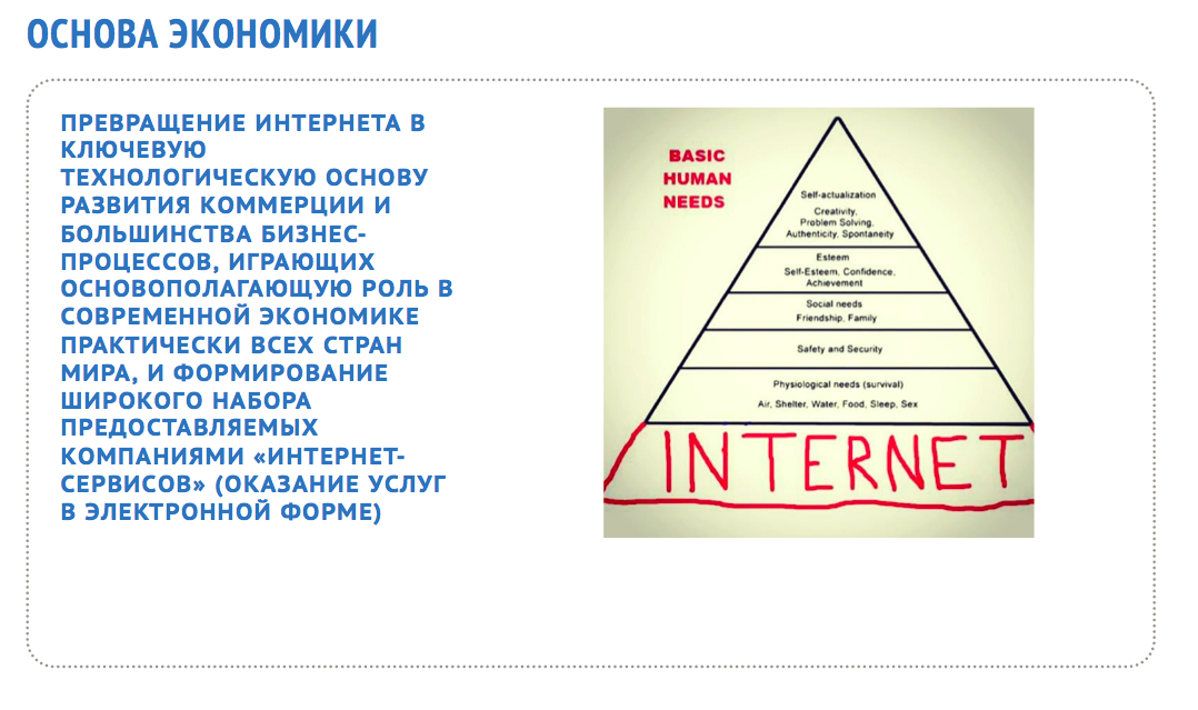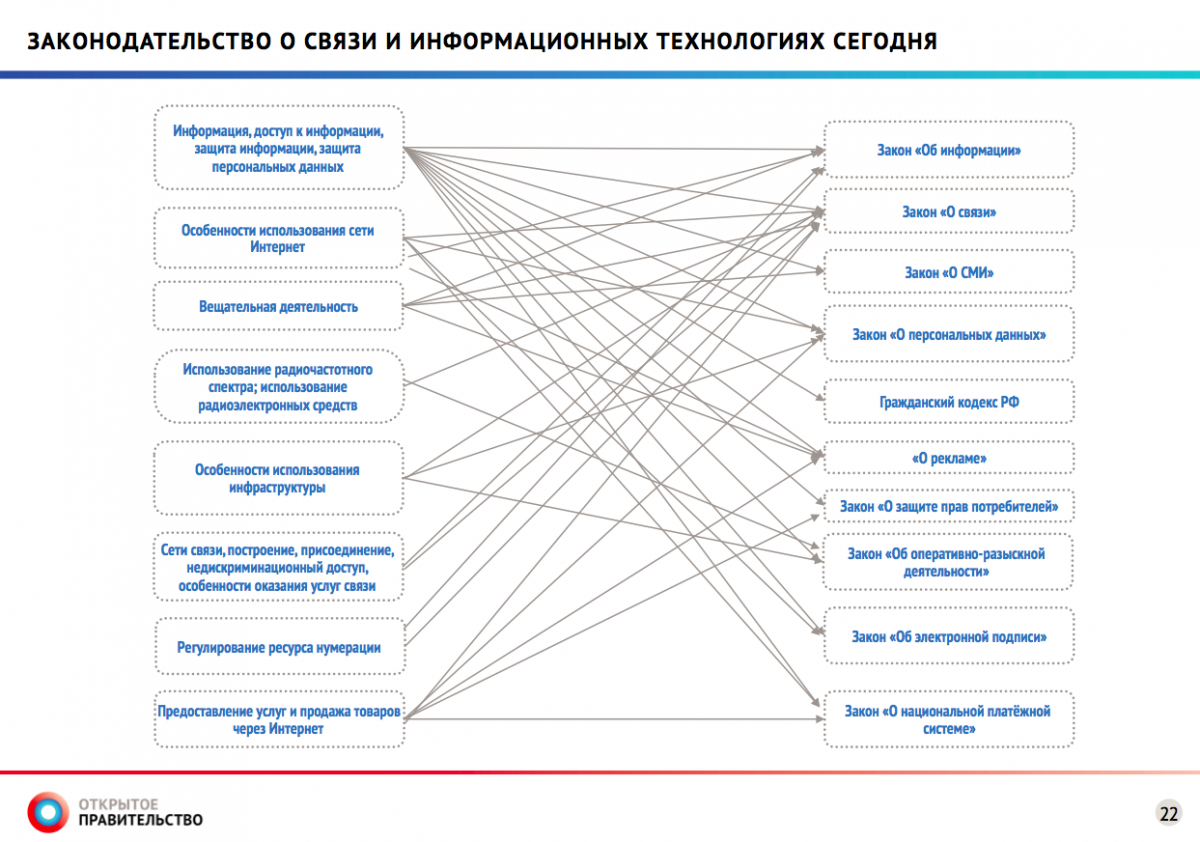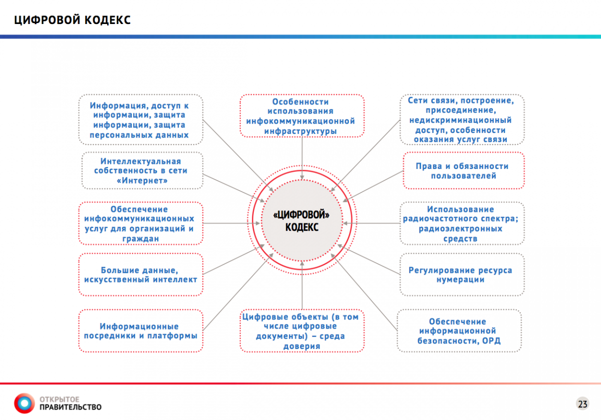 Для начала о докладе директора по стратегическим проектам Института развития интернета Ирины Левовой. Она рассказала про концепцию так называемого "Цифрового Кодекса" — новой парадигмы регулирования сферы ИКТ и будущей цифровой экономики.