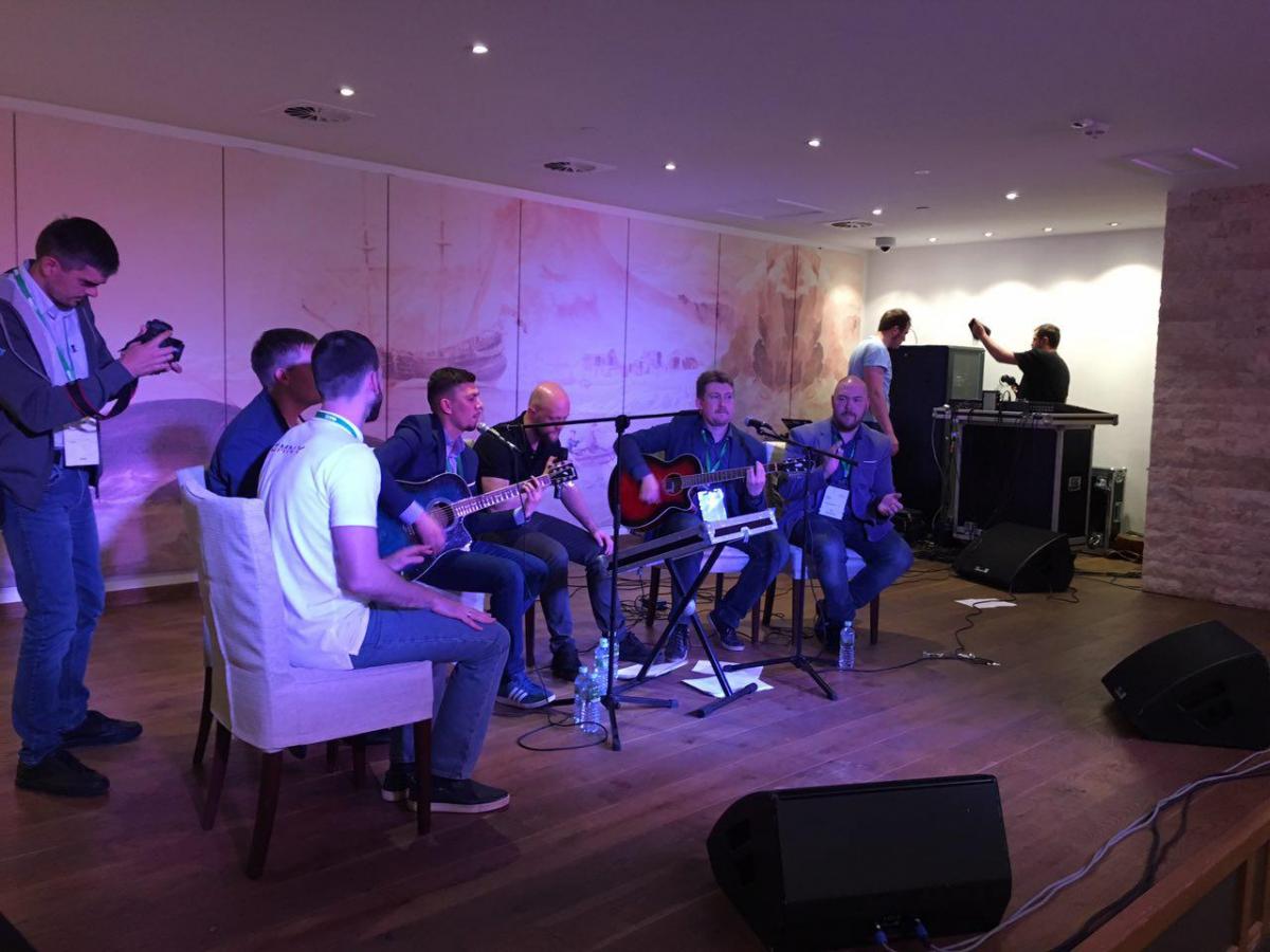 А к концу вечера на сцену вышла другая музыкальная команда - провайдерская. К сожалению, я в этот момент ускакала писать этот репортаж и заниматься другой главредской работой, так что могу только полюбоваться фотографией и послушать видеозаписи, что выложили в общий чат. Но, говорят, ребята будут петь и завтра - тогда поделюсь впечатлениями.