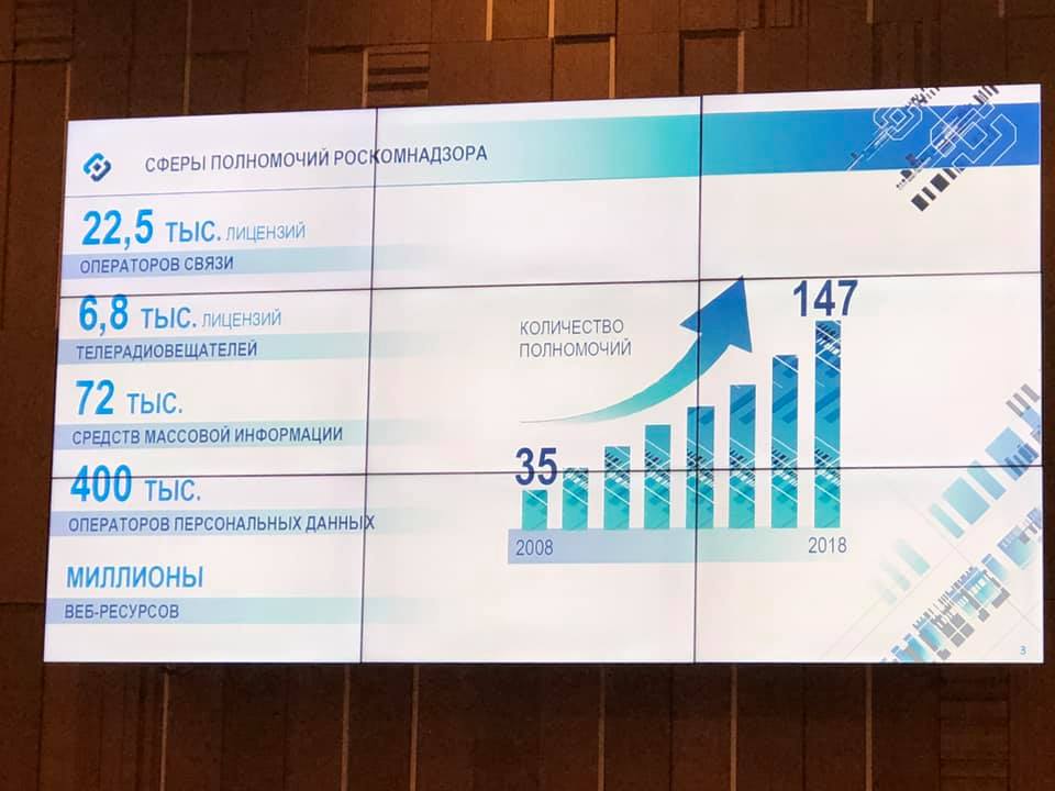 Отвечая Носкову, руководитель Роскомнадзора Александр Жаров подтвердил, что полномочия действительно расширились с момента основания регулятора в 2008 году: вместо 35 их стало 147, и частично приписал эту "заслугу" Госдуме, в том числе ее комитету по информационной политике.