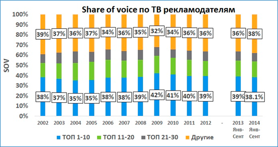 Если рассматривать ситуацию в долгосрочном периоде, то доля ТВ-рекламодателей из десятки лидеров падает (38,1% против 39% годом ранее), в то время как доля рекламодателей, не входящих в первую тридцатку, растет. Такая тенденция характерна для периода экономического роста, отмечается в исследовании Initiative.