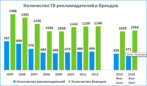По сравнению с итогами третьего квартала 2013 года число рекламодателей на российском телевидении увеличилось с 439 до 471, а количество брендов — с 1029 до 1054.