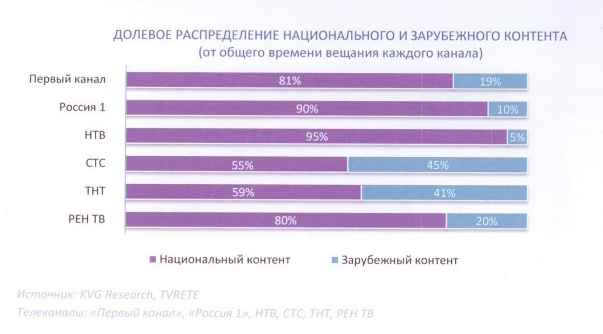 Аналитики отмечают, что пока "российские продакшн-компании не могут составить конкуренцию зарубежным игрокам по двум направлениям: кинотеатральные фильмы, 83% от всех телетрансляций которых занимают зарубежные проекты, а также анимационные фильмы и сериалы, где зарубежным производителям принадлежит 83,4% эфира".