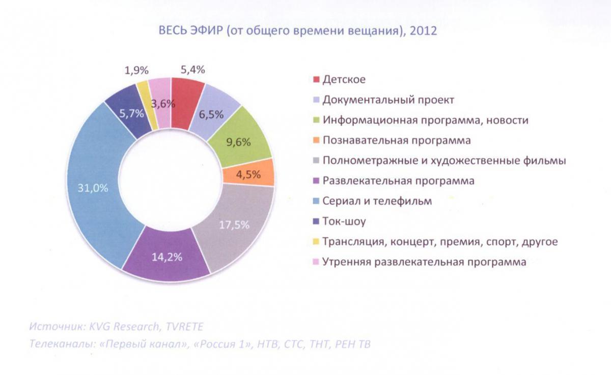 Сегодня KVG Research совместно с ЕАО провели пресс-конференцию, где поделились ключевыми результатами данного исследования. В первую очередь они рассказали о контенте на главных эфирных каналах — "Первом канале", "России 1″, НТВ, СТС, ТНТ и РЕН ТВ. По данным аналитиков, в 2012 году на перечисленных каналах было показано 44 тысячи часов телевизионного контента. Из них 31% эфира заняли сериалы и телефильмы, 17,5% — полнометражные и художественные фильмы и 14,2% — развлекательные программы.