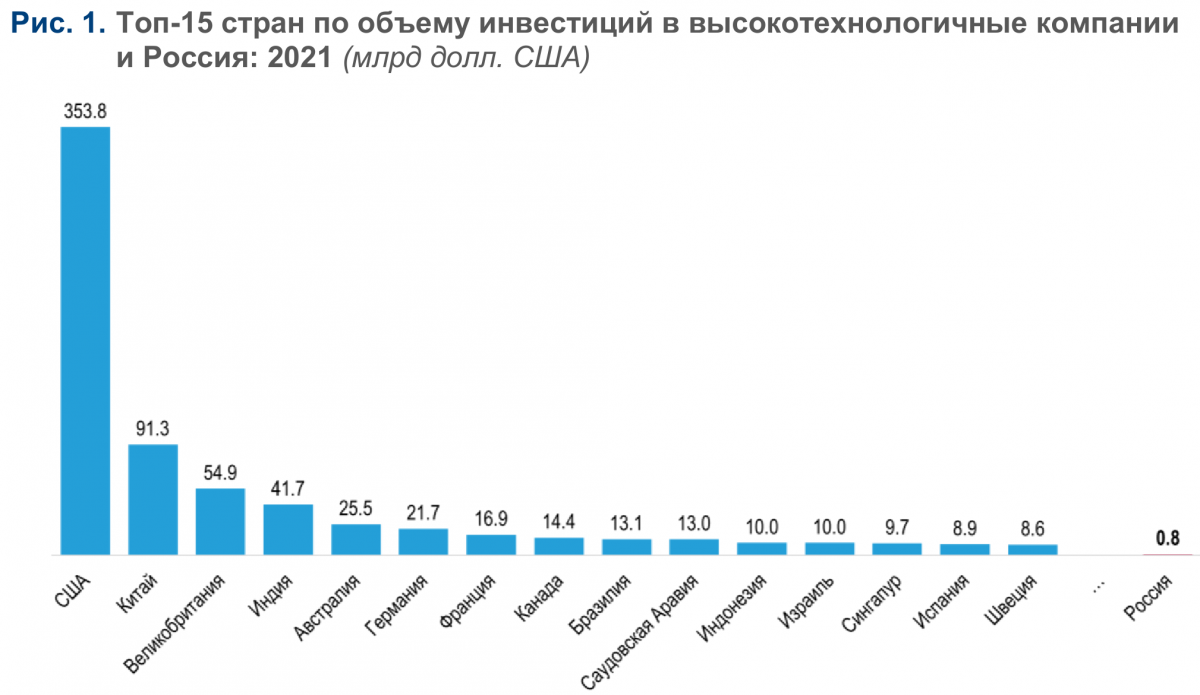 В 2021 году пятерку лидеров по масштабам финансовых вложений в хайтек возглавляли США ($353,8 млрд), за ними шли Китай ($91,3), Великобритания ($54,9), Индия ($41,7) и Австралия ($25,5). Их совокупная доля инвестиций составляет 72,9%, причем почти половина (45,4%) приходится на США. Россия занимает 38 место ($0,8 млрд) — для учета были взяты только высокотехнологичные компании, зарегистрированные в РФ.