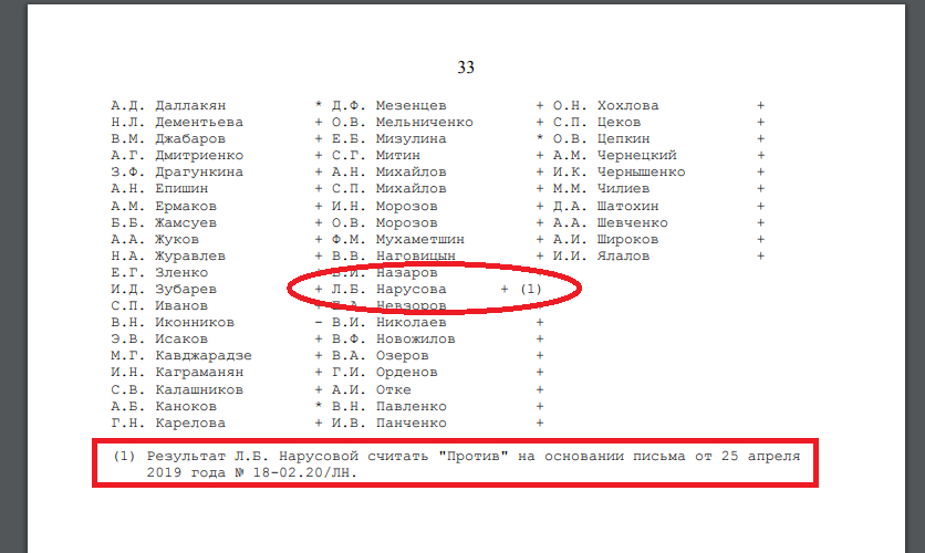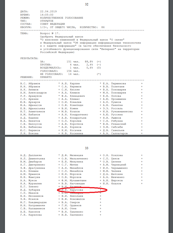 Сенатор Людмила Нарусова, голосовавашая против закона о "суверенном Рунете", обнаружила, что в списке официальных результатов напротив ее фамилии стоит голос "за", пишет "Фонтанка". Эти списки публикуются в поимённом режиме на странице каждого заседания.