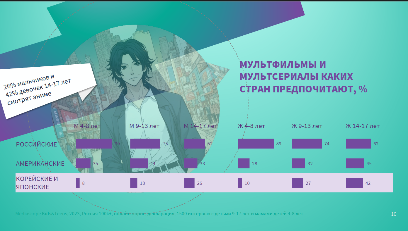 Корейская и японская мультипликация также больше нравится российским девочкам: в 9-13 лет 27% девочек смотрят аниме, в 14-17 лет – уже 42%. У мальчиков интерес слабее: в 9-13 лет аниме привлекает 18%, в 14-17 – 26%.