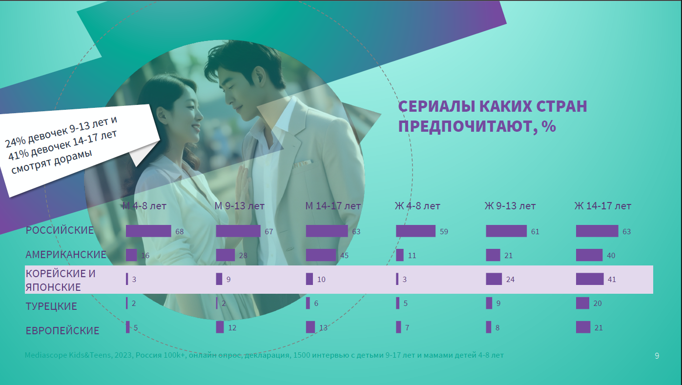 Исследование Mediascope, посвященное феномену популярности корейской культуры в среде российской молодежи, показало, что почти половина подростков 9-17 лет (48%), проживающих в городах России с населением более 100 тыс. человек, проявляет любопытство в отношении дорам, аниме, манги или k-pop.