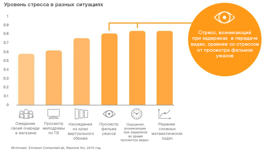 В условиях дефицита времени задержки в загрузке сайтов и видео вызывают учащение пульса на 38%. Шестисекундная пауза в трансляции потокового видео приводит к скачку уровня стресса на треть. Для сравнения - аналогичный стресс вызывает тест по математике и просмотр фильма ужасов в одиночку. Паузы, возникающие во время просмотра видео, также вызывают значительное напряжение нервной системы.
